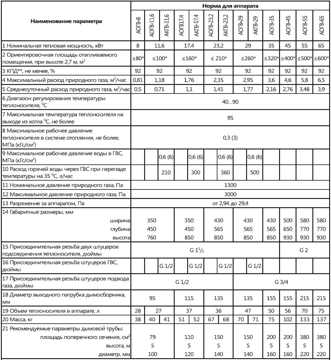 Котел Очаг полностью энергонезависим и работоспособен в отопительных системах с нормальным (рабочим) давлением до 3 атм как закрытого - принудительного типа с насосом, так и открытого типа при естественной циркуляции теплоносителя. Маркировка агрегатов "Очаг" достаточно проста, рядом с аббревиатурой А-О-Г-В (аппарат отопительный газовый водогрейный) стоит цифра, указывающая на мощность котла в кВт, после которой буква указывает на автоматику котла: